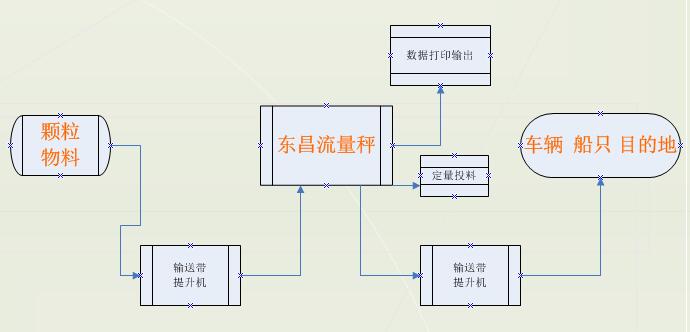東昌采用的連續輸送的顆粒散裝物料計量系統,由輸送裝置(輸送帶或提升機),東昌流量秤,和數據打印輸出裝置組成,所需設備十分簡單,卻可以滿足大吞吐量的流動性顆粒散裝物料(如糧食、化工顆粒)的稱重和計量。計量過程如圖1,所需計量的散裝顆粒物料,通過輸送帶或提升機提高輸送,至東昌流量秤計量體,經流量秤計量后流出流量秤,再經由輸送帶或提升機組合送至目的地或直接裝車,裝船。計量后的數據可以在東昌流量秤儀表上直接讀出,或經數據打印機打印輸出。