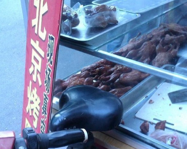 4月8日,記者對北京西站等地的烤鴨市場進行了暗訪。北京西站旁的北蜂窩西路上,一個流動攤販的推車前掛著“北京烤鴨25元/只”的牌子。推車的玻璃柜里陳列著20多個烤好的鴨子,玻璃柜上方還放著已經包裝好的“全聚德”和“金聚福”的烤鴨,旁邊還有幾個全聚德烤鴨的包裝袋。