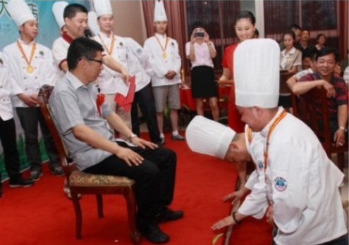 7月10號晚,“當代四大名廚”陳緒榮在湖北黃石陽新舉行了盛大的收徒儀式!收徒儀式由大冶市烹飪餐飲業協會常務副會長兼秘書長羅文主持,黃石市烹飪餐飲業協會和大冶市烹飪餐飲業協會的眾多嘉賓到場祝賀,北京、江西和武漢等地的弟子專程前來賀喜。首先,我號召同行承諾推廣綠色食材和綠色烹飪的“生態宴”,并在“食品安全低碳環保‘生態宴’”簽名墻上簽字,大家踴躍寫上自己的名字;隨后,收徒儀式以傳統的拜師形式舉行,按跪拜、敬茶、頒發證書和合影等程序進行;最后,嘉賓和弟子登臺發表致辭。