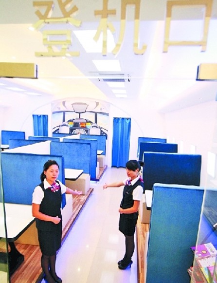 “歡迎登機!”一進入餐廳,你就能看到服務(wù)員彎著腰,做出歡迎的手勢。“我們的服務(wù)員都是參考空姐的標準來招收,要求身高160cm以上,長相清秀,笑容甜美等。”黃慧玲介紹說,服務(wù)員統(tǒng)一著空姐制服,上班前還得接受餐飲禮儀和空姐服務(wù)方面的培訓(xùn)。