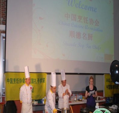 當(dāng)天下午,為迎接訪問(wèn)團(tuán)的到來(lái),校方特別組織了名為《舌尖上的中國(guó)》主題課程,兩百多位學(xué)生被中國(guó)美食所吸引主動(dòng)報(bào)名參與課程。訪問(wèn)團(tuán)成員,來(lái)自于中國(guó)廚師之鄉(xiāng)順德的羅福南、林潮帶、連庚明、馬澄根等幾位大師首次在美國(guó)孔子學(xué)院的講堂上進(jìn)行了精彩的演講課程和技藝展示,大師們的精湛技藝征服全場(chǎng),現(xiàn)場(chǎng)不時(shí)地爆發(fā)出熱烈掌聲,菜肴的美味令學(xué)生們垂涎不止,紛紛跑上臺(tái)與大師們互動(dòng)交流,同時(shí)也迫不及待的要品嘗美味。