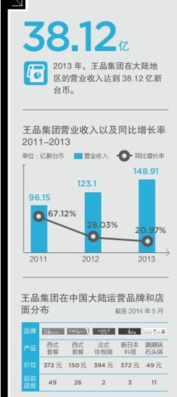 據王品集團的財報, 2013財年,其在大陸的品牌門店營收達到7.7億元,較2012年的5.6億元相比,增長37.5%。