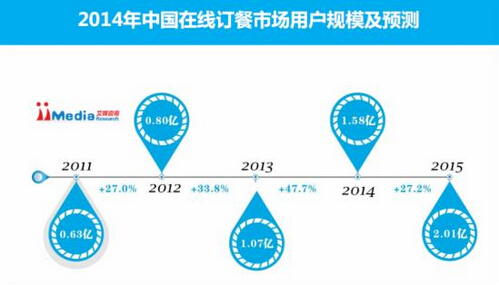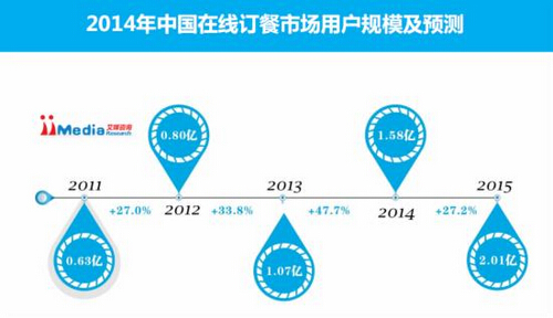 iiMedia Research數(shù)據(jù)顯示,2013年中國在線訂餐市場(chǎng)用戶規(guī)模達(dá)到1.07億,預(yù)計(jì)2014年中國在線訂餐用戶規(guī)模將達(dá)到1.58億。