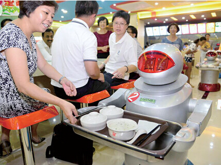 全國(guó)首家機(jī)器人餐廳日前亮相江蘇昆山。走進(jìn)這家餐廳,“大黃蜂”為您唱歌跳舞,“擎天柱”的兄弟“鐵皮”負(fù)責(zé)安保,禮儀機(jī)器人親切迎賓,科幻片中的奇妙場(chǎng)景變?yōu)楝F(xiàn)實(shí)。這些機(jī)器人掌握了迎賓、點(diǎn)餐、傳餐、炒菜、烹炸、煮水餃、下面條等本領(lǐng),還會(huì)說(shuō)40句基本用語(yǔ),如“你的菜到了,請(qǐng)慢用”等,當(dāng)你擋住機(jī)器人的路時(shí),它則會(huì)說(shuō)“請(qǐng)讓一下,我很忙噠!”