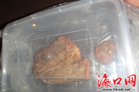 陳先生夫婦到海甸島三東路與人民大道交匯處某茶藝快餐廳就餐時,發現全熟的牛排肉體內有疑似已經死亡的蟲子類物體,要求餐館負責人與其一道將該食物送到附近醫院化驗遭拒后,遂向食品藥品監督管理部門投訴。今天(11日)上午,美蘭區食品藥品監督管理局執法人員對該牛肉食品進行封存送檢。