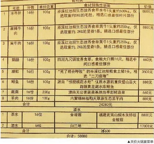 24280元菜金,26600元茶酒錢,一桌火鍋年夜飯總消費50880元。你以為有錢就能當個任性的吃貨?大錯特錯!