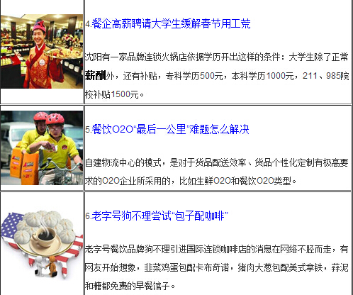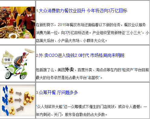 老字號狗不理包子引進咖啡連鎖店,包子配咖啡的混搭引起網友熱評;臨近春節(jié),餐飲服務員緊缺,有餐企特別歡迎大學生寒假兼職餐館服務員,并給予特殊補貼;據統(tǒng)計,2014年餐飲業(yè)收入數據終于回升,2015年將向3萬億目標邁進。