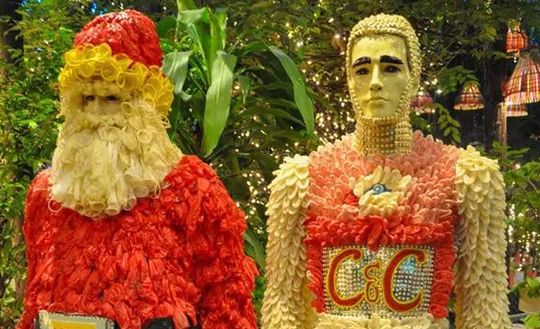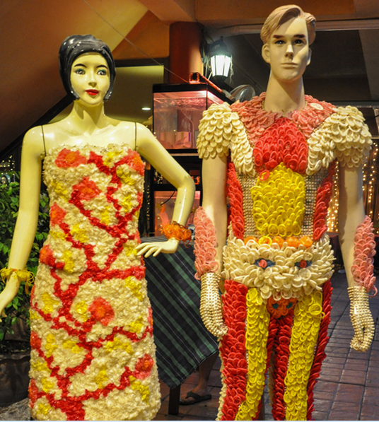 餐廳院子里擺的人形模特讓人眼前一亮,他們都穿著用上萬個避孕套做成的五彩衣服,這樣的配色,這樣的做工恰當(dāng)?shù)膭倓偤茫瑳]有一絲瑕疵和多余,完全可以稱得上是藝術(shù)品。