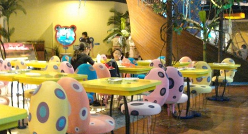 曾經(jīng)紅極一時的連鎖兒童主題餐廳“芭迪熊”在其第一家店中,讓小朋友吃飯前先進行探險。小朋友們需要登上一條木制“帆船”,開始探險之旅:在沙灘區(qū)有“椰子樹”和花朵形餐桌;在海洋區(qū),獨一無二的水母椅子、可愛的大蘑菇飲料站都很吸引小朋友。