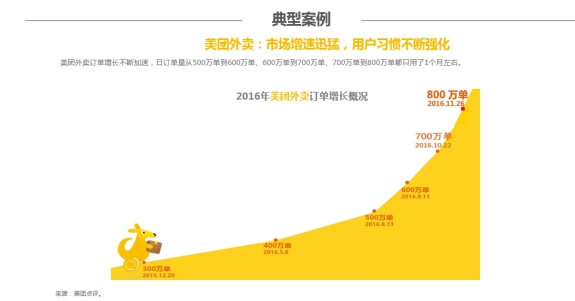 近日,美團點評數據研究院發布《2016中國外賣O2O行業洞察報告》。報告顯示,在政策鼓勵、消費升級、技術發展、用戶習慣養成等諸多有利因素的助推下,2016年外賣O2O業務獲得高速發展,用戶量持續增長、發展空間充裕,僅美團外賣日訂單量就已超過800萬單。
