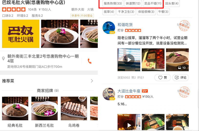 一周后,記者再次來到北京店就餐,店內餐位已經全部開放,仍然供不應求。據巴奴門店負責人透露,巴奴北京店定位為毛肚專家旗艦店。試營業當天賣了100多桌,此后幾天的數據都有增加。而從顧客的綜合評價來考核,截至發稿,巴奴北京店在大眾點評上已得到五星好評。97條評價中,好評89條,中評6條,差評2條。好評所夸贊的地方主要在服務、菜品、店面風格、鍋底等方面,其中超過30位顧客點了“服務好”這個標簽,而中評和差評指出的問題在價格偏貴(記者實測,人均消費150左右)、餐位預定等方面。